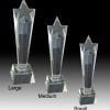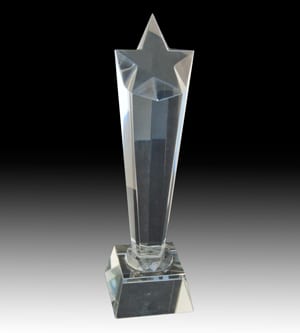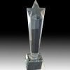 A crystal tapered base with a diamond cut ring on top, supports a pentagonal column shaped as a star.