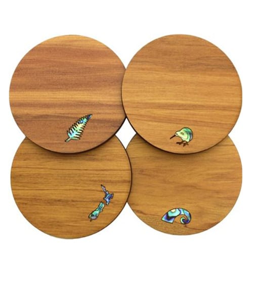 Set of four different coasters, Fern, Kiwi bird, NZ map, Koru with paua inlay. Crafted from natural Rimu in New Zealand.
