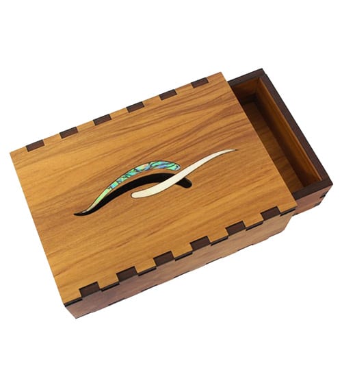 Gift box, wave design with NZ’s pearl and paua inlays. Crafted from natural Rimu in New Zealand.