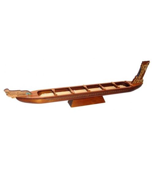 Dark stained Waka crafted from Agathis Kauri with cane flooring and paddles. The stern and prow feature Kauri filligree and Paua inlays.