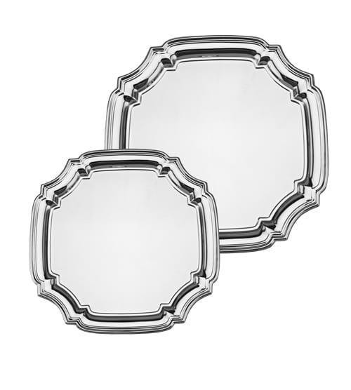 Decorative square edged silver plated tray available in two sizes.