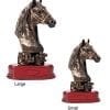 Bronze coloured horse’s head on a gloss wood-finish base, molded from resin as one unit.