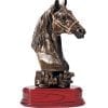 Bronze coloured horse’s head on a gloss wood-finish base, molded from resin as one unit.