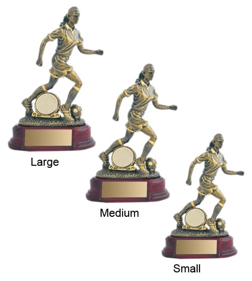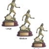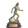 Bronze coloured running female with football ball figures set on a gloss wood-finish base, molded from resin as one unit.