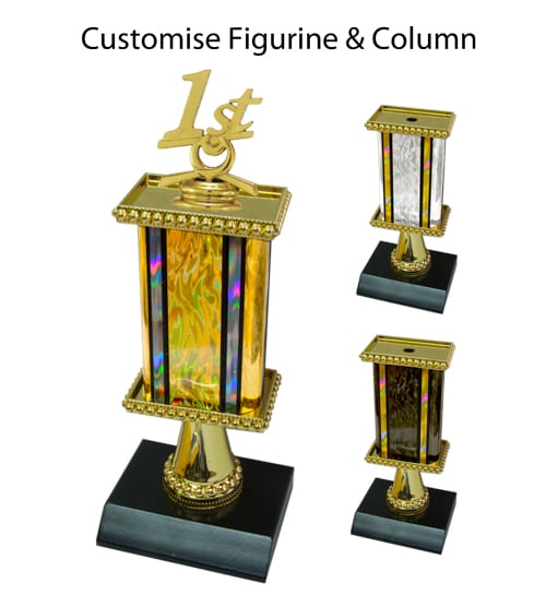 Waitomo Trophy – In three sizes. A black gloss wood base, with a molded plastic column in gold, silver or black. A figurine can be selected for the top.