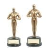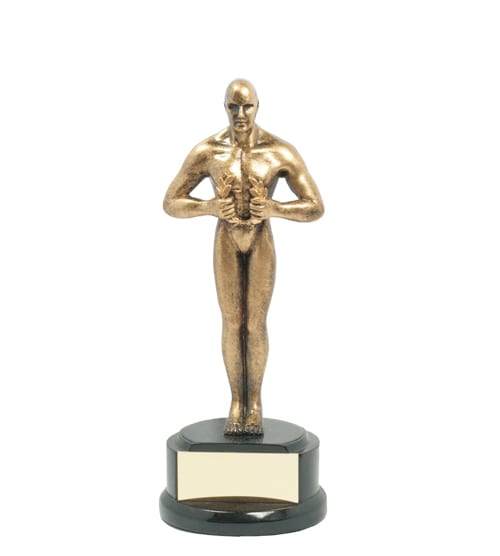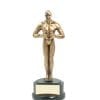 A bronze male figure holding a wreath, set on a black base, molded from resin as one unit.