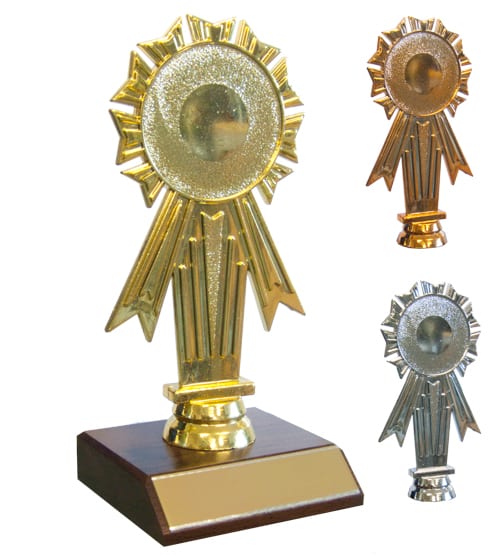 Plastic rosette shaped holder in bright gold, silver and bronze.