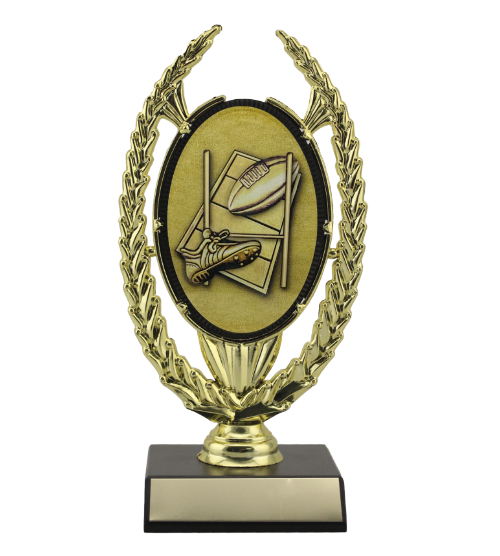 Gold oval wreath holder with rugby image, secured to a small wood base.