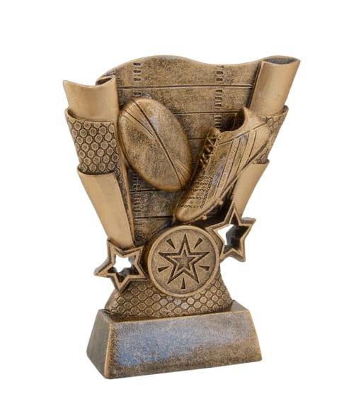 Rugby Trophy with antique gold finish, molded from resin as one unit.